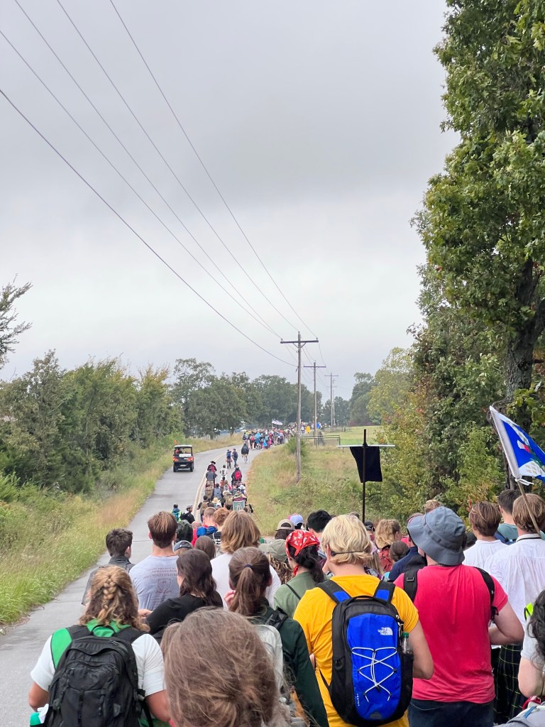 We got up early the next morning, but the volunteer breakfast crew must have had us beaten by hours. Thanks to them, I began the hike with a belly full of granola and apples and a thermos of coffee. The Lord scourges and then has mercy. As we walked, and spirits began to rise, I saw something that struck me. I alluded previously to the organization of the pilgrimage, and how flawlessly the thousands of pilgrims were provided for. One less than pleasant reality is the number of bathrooms required for thousands of people. Wherever we pilgrims were, dozens of portajohns were always available. I didn’t question it– no doubt the rental company, in my mind, had distributed them to these checkpoints beforehand. However, as we walked that morning, praying the rosary, I saw a thirty year old Silverado with a gooseneck trailer hauling a dozen of these restrooms down the road. I was moved– no rental companies here. This was obviously a local volunteer donating his resources and time to serve us in the least glamorous capacity. My feet moved more lightly, and my heart surged with gratitude for these people. The amount of volunteer effort throughout the pilgrimage was staggering. From the check-in process, to cooking, to loading and unloading our camping gear, to supporting us along the route, to moving bathrooms, to organizing and driving us pilgrims, to providing flowers for Mass, these men and women worked around the clock to give us the chance to suffer, pray, and rejoice. They themselves did not get the opportunity to walk with us, to share our conversations, songs, and laughter, but certainly sacrificed much more than we did. With these men and women supporting us, I felt especially grateful for the opportunity to walk the pilgrimage. I extend my heartiest thanks to the volunteers who made this possible.